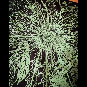 This majestic illustration by Spanish artist Iria Moura features classic Plant Spirits associated with Protection in Western and Mediterranean plant lore. In the front, the phrase 'Protected by plant Spirits' is flanked by mullein, hyssop, wormwood, and a bee. In the back, a huge carline thistle is accompanied by rosehips, fern, bay laurel, oak, and hawthorn, the mightiest protectors of the Green Realm.