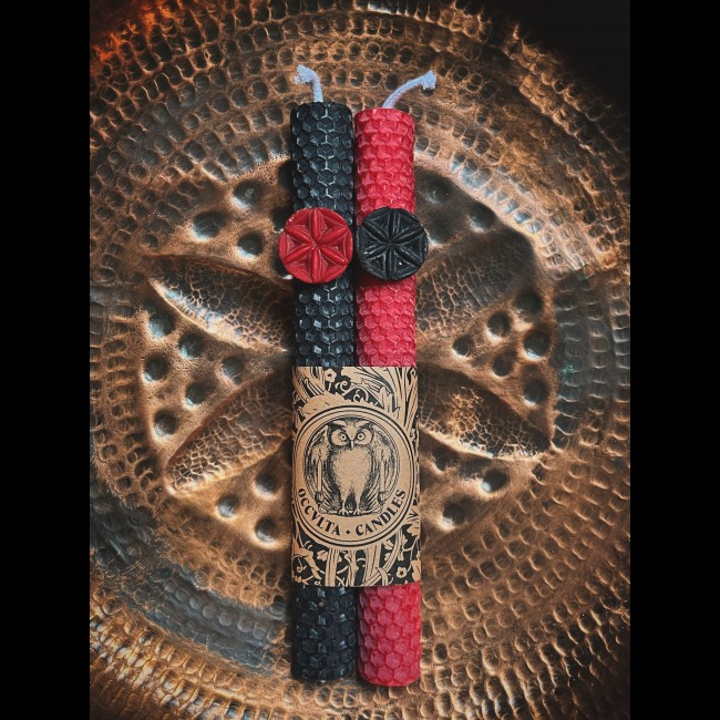 Crafted in red and black (traditional colors linked to soil fertility and the power of blood in sacrifice and connection), these hand-rolled beeswax candles are intended for ancestor work, rites of protection, remembrance, funerary and closing rituals, and the search for connection.