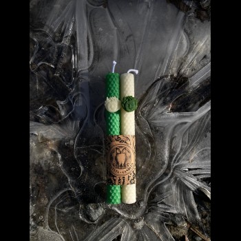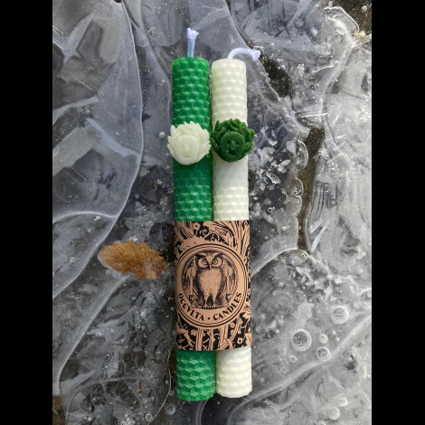 Crafted in white and green, the colour of rebirth, purity, and transmutation, these hand-rolled beeswax candles feature Neirahda's traditional winter masquerade. These candles can be used in works of clarity, catharsis, purification, cleansing and renovation.