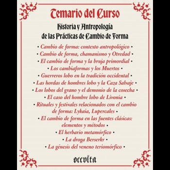 Este curso ofrece un análisis en profundidad del teriomorfismo y el cambio de forma a lo largo de la historia. Desde las fuentes clásicas hasta la creencia popular más reciente, profundizaremos en la transmutación del Doble espiritual y en sus posibles aplicaciones en nuestras prácticas espirituales y mágicas utilizando el folklore y la etnobotánica como base.