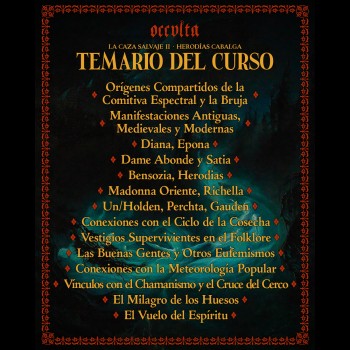 Este curso explorará los orígenes compartidos de la comitiva espectral y la bruja primordial, desde deidades antiguas como Diana y Epona hasta figuras medievales y modernas como Dame Abonde, Herodias y Perchta. Profundizaremos en sus vínculos con el Ciclo de la Cosecha, la meteorología popular y las prácticas chamánicas como el Cruce del Cerco. Aprenderemos sobre el "Milagro de los Huesos" y el Vuelo del Espíritu, mientras descubrimos cómo estas figuras influyeron en las creencias eufemísticas en las Buenas Gentes, también conocidas como las Hadas.