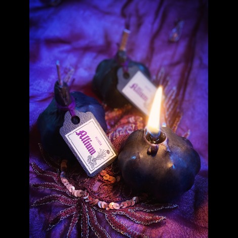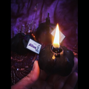 Hecha con cera de abeja de color negro violáceo intenso, vertida en un molde hecho por nosotros mismos con ajos de verdad. Inspirada en el deipnon o las cenas de Hécate (ofrendas dejadas en la encrucijada para honrar a la diosa y apaciguar a los espíritus errantes), esta vela sirve tanto como ofrenda en trabajo devocional como artefacto apotropaico, alejando fuerzas malévolas o parasitarias.